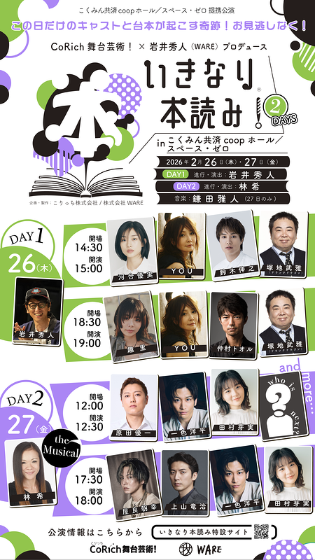 2月26日(木)15:00 / 19:00 DAY1「いきなり本読み!」 進行・演出:岩井秀人 出演:河合優実、趣里、YOU、鈴木伸之、塚地武雅、仲村トオル 2月27日(金)12:30 / 18:00 DAY2「いきなり本読み!the Musical」 進行・演出:林希 出演:原田優一、一色洋平、上山竜治、屋良朝幸、田村芽実・・・and more |
